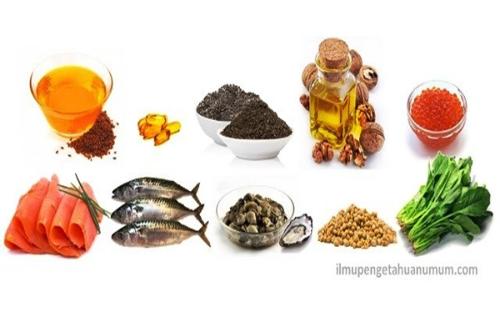 Ikan salmon, ikan makarel atau tenggiri, ikan sarden, halibut, herring, tuna, tiram, kerang, ikan kod, dan belut.